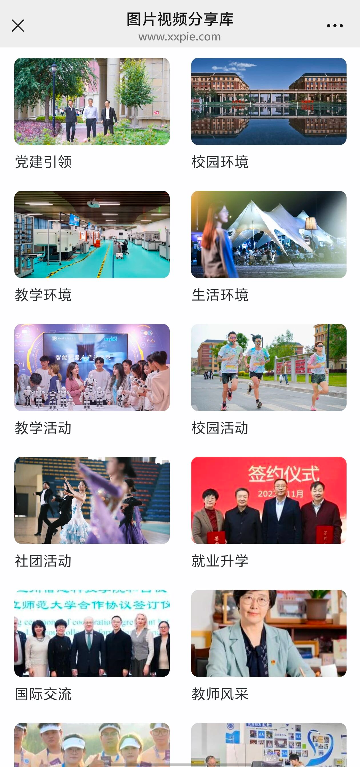 本次全新上线的“图片视频分享库”,包含党建引领、校园环境、教学环境、生活环境、教学活动、校园活动、社团活动、就业升学、国际交流、教师风采、学生风采、师生互动等核心版块,全面覆盖校园生活的每一个高光时刻。