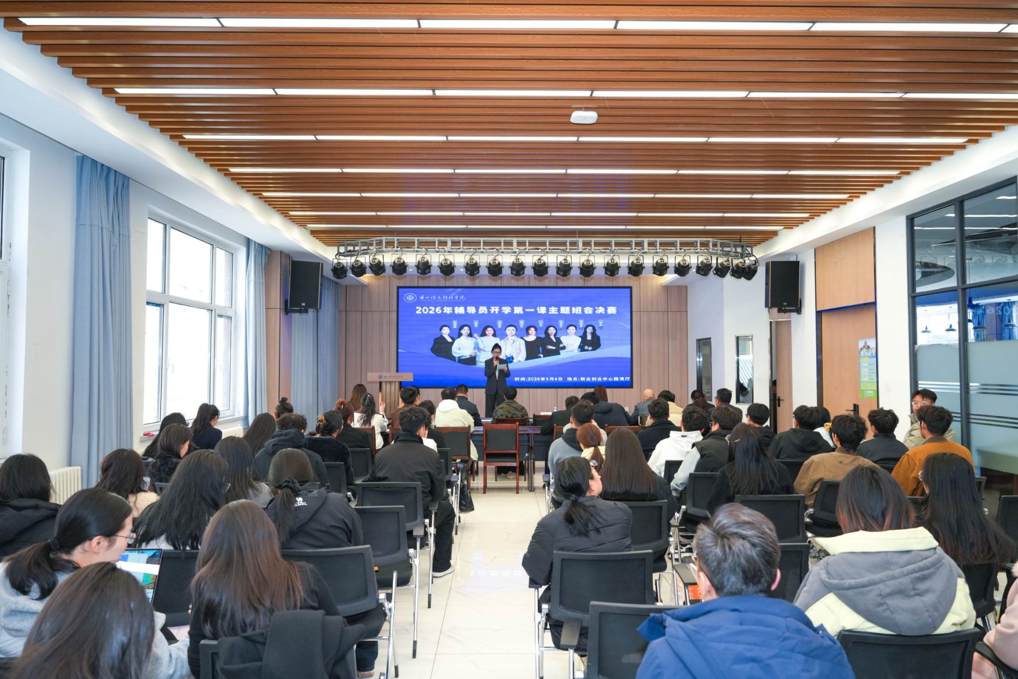 春风启序,育人为本;匠心筑梦,润物无声。为持续提升辅导员思政育人专业能力,打造有温度、有深度、有力度的“开学第一课”,让新学期的思政教育真正走进学生心里,3月4日,兰州信息科技学院2026年春季学期辅导员“开学第一课主题班会”决赛在就业创业中心路演厅精彩开赛。一场场精心打磨的主题班会,一次次温暖走心的思想碰撞,彰显着兰州信息科技学院辅导员队伍的育人担当与专业风采。