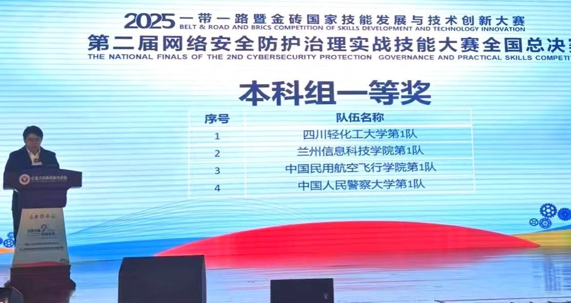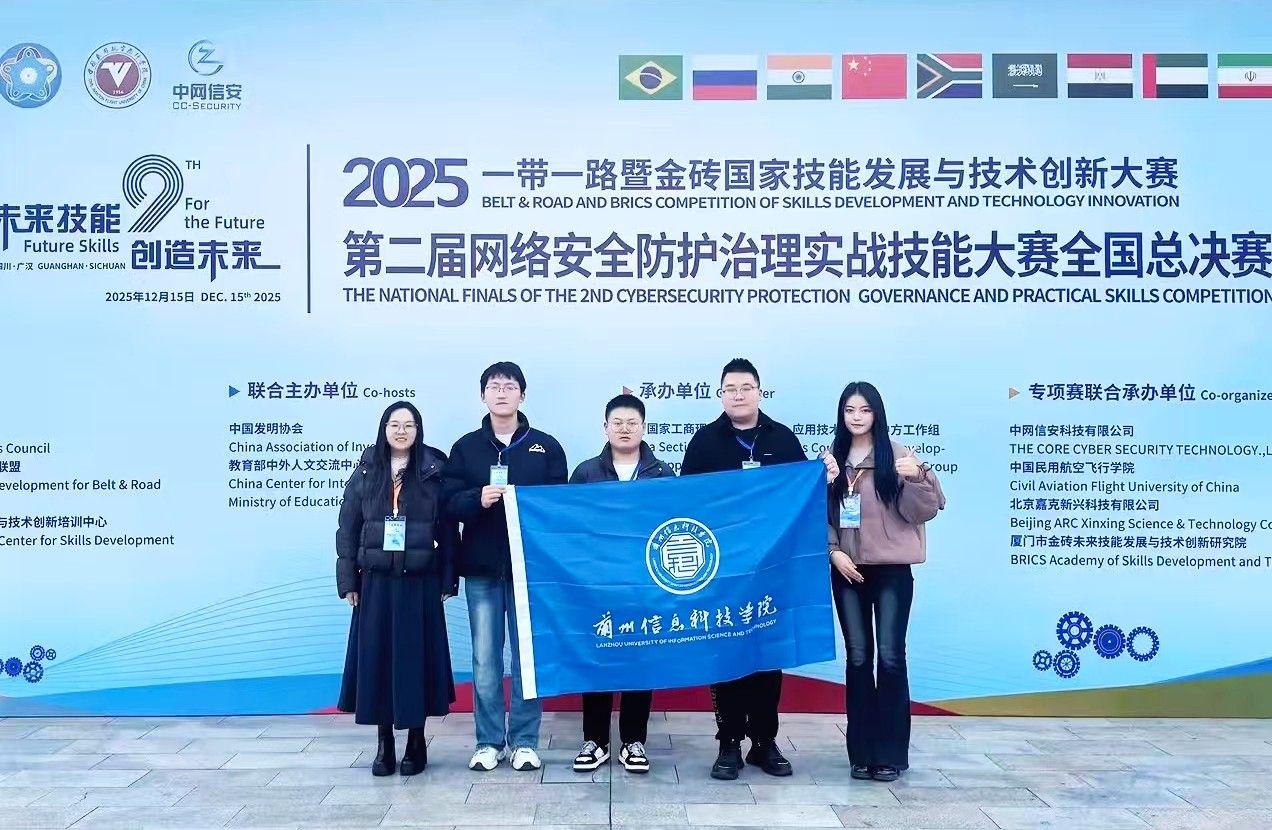 为加快构建高质量网络安全人才培养体系,12月15日,2025一带一路暨金砖国家技能发展与技术创新大赛之第二届网络安全防护治理实战技能大赛全国总决赛在中国民用航空飞行学院圆满落幕。兰州信息科技学院计算机与人工智能学院参赛团队凭借扎实的专业功底与高效的实战能力斩获本科组一等奖,是省内同类院校唯一获奖高校。