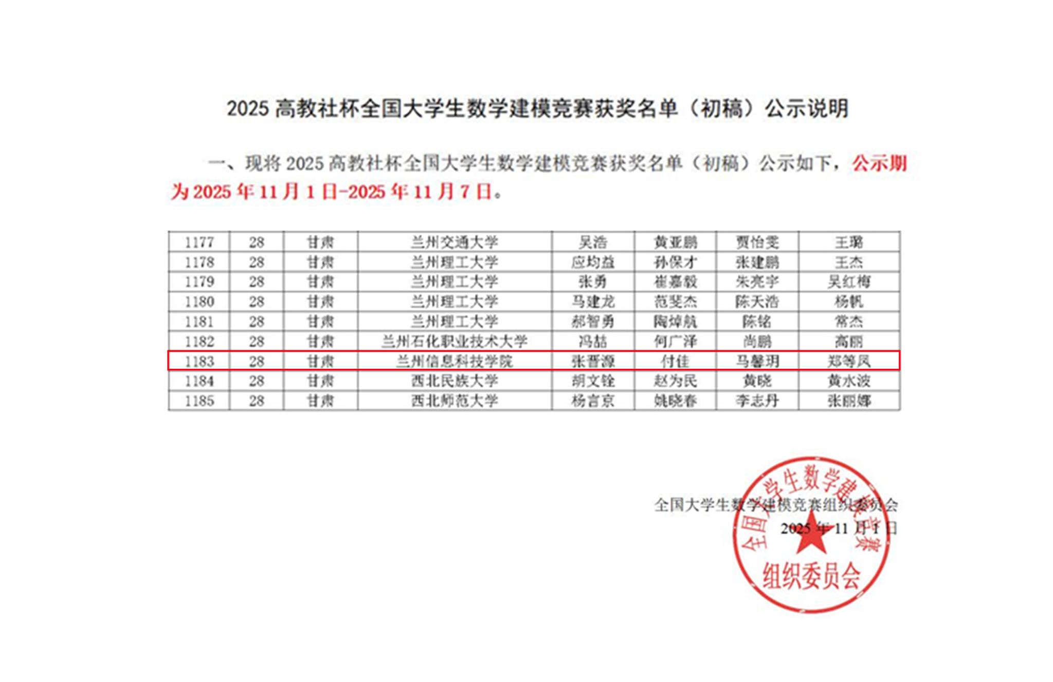 近日,2025年全国大学生数学建模竞赛获奖名单揭晓,兰州信息科技学院参赛学子凭借扎实的专业基础和出色的实践能力,荣获国家级二等奖1项,学校成为甘肃省同类院校中唯一获得国家级奖项的高校。