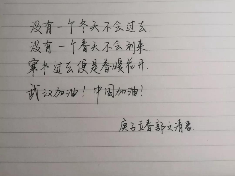新型冠状病毒感染的肺炎疫情,牵动着我们每个人的心。有一份寄托,夹杂着最诚挚的祝福和敬意。有一种爱,是从远方牵挂担心。隔离病毒但未曾隔离爱,此时此刻,我们关注疫情,共战疫情,“精感石没羽,岂云惮险艰。”我校学子用一笔一划,写下祝福与期盼。一撇一捺,记录鼓励与感动。送给抗疫第一线夜以继日奋战的医护人员,送给那些无私奉献的可爱人儿,为武汉加油!为湖北加油!为中国加油!