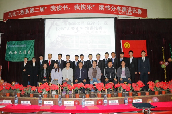 此次活动经各班级推荐,团学干部选拔,最终李冰等15名同学脱颖而出,进入决赛,比赛中各位选手热情饱满、激情洋溢,努力将自己所读的书籍推荐给大家,为我们呈现了一场精彩的读书盛宴,经过激烈的角逐,16级机设6班李兵同学凭精彩表现一举夺魁,会后,全体老师和参赛选手合影留念。