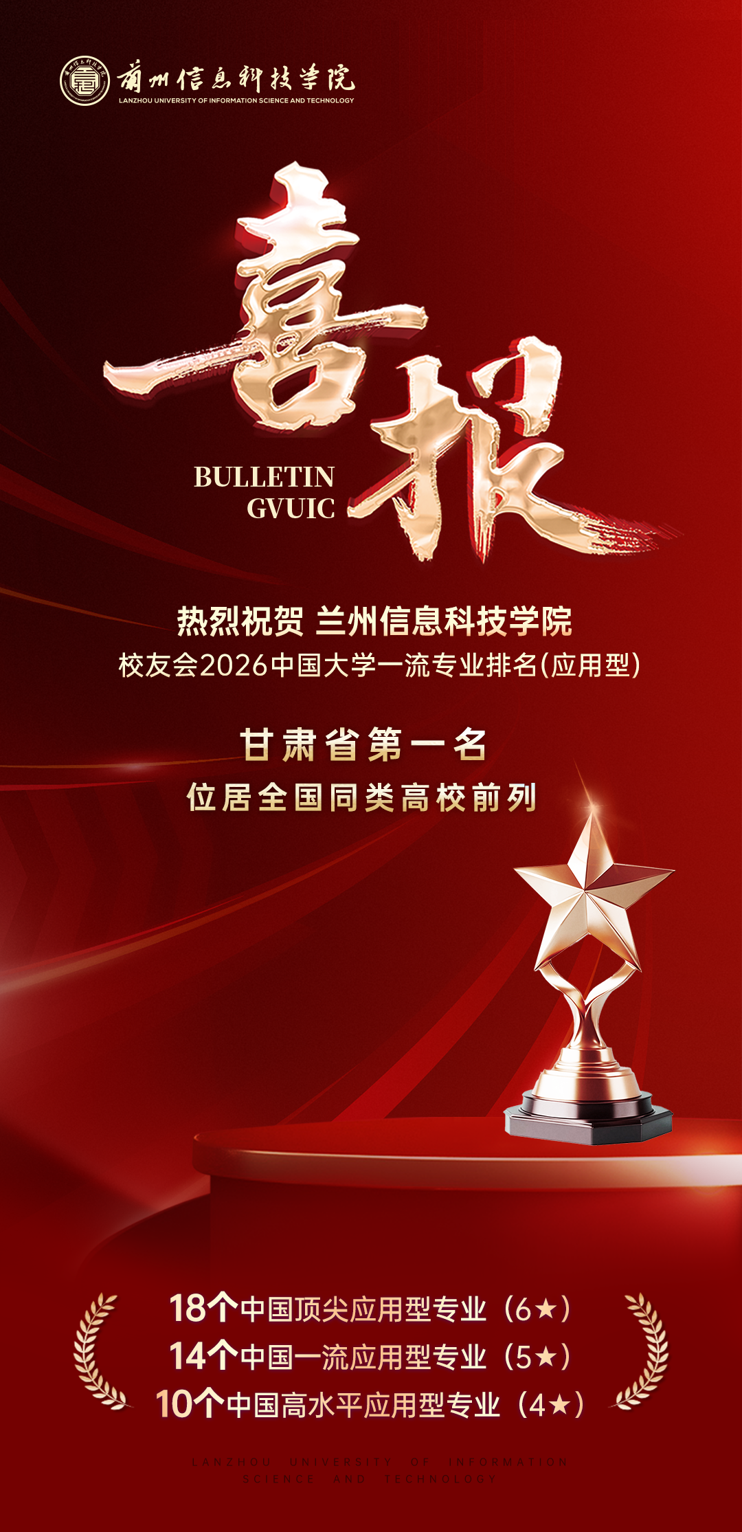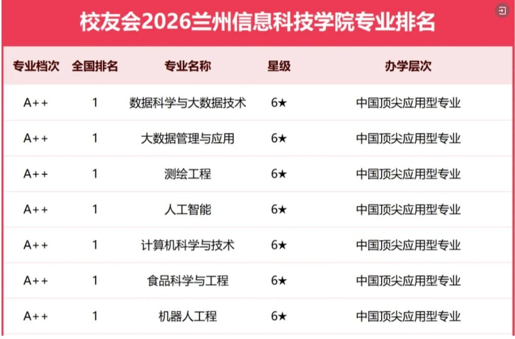 4月13日,全国第三方大学评价机构艾瑞深校友会网(Cuaa.net)正式发布《校友会2026中国大学一流专业排名》,在此次校友会2026中国大学一流专业排行榜单中:兰州信息科技学院雄居2026甘肃省大学一流专业排名(应用型)第1名,位列全国同类高校前茅。7个专业全国排名第一(应用型)、18个专业加入中国顶尖应用型专业(6★)行列、14个专业跻身中国一流应用型专业(5★)行列,10个专业入围中国高水平应用型专业(4★)。这些亮眼的成绩充分彰显了兰州信息科技学院在应用型人才培养领域的领先地位与广泛影响力。