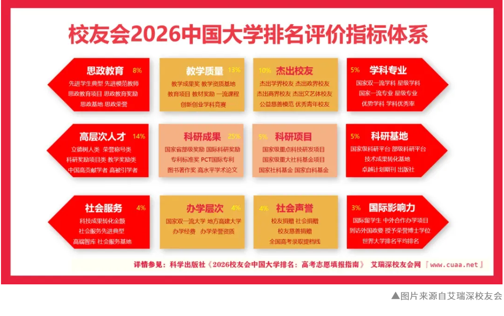 校友会中国大学排名是目前中国评价体系最为系统全面、客观独立,评价体系与评价方法最为稳定,评价指标和参评高校数量最多,最符合国家政策和价值导向的中国大学排名。多年来,校友会中国大学排名相关成果被人民日报、中央电视台(CCTV)、光明日报、中国青年报、中国教育报等上百家国内外权威主流新闻媒体广泛转载、报道和引用,具有广泛社会影响力和公信力。