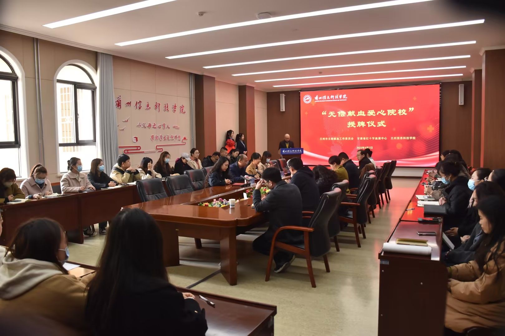 为表彰学校无偿献血工作的贡献,兰州市无偿献血工作委员会、甘肃省红十字血液中心决定授予学校“无偿献血爱心院校”称号。2023年4月7日上午,“无偿献血爱心院校”授牌仪式在106会议室隆重举行。甘肃省血液中心副主任李永铭、甘肃省血液中心招募科科长李娟、甘肃省血液中心招募科副科长龚娱霄、甘肃省血液中心招募科宣传讲师陈立霞、学校校长助理师帅,学生处、团委全体成员,各二级学院学生发展中心主任、团总支书记、全体辅导员,献血学生代表参加了仪式。