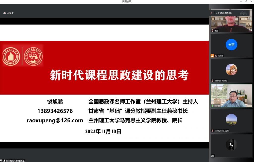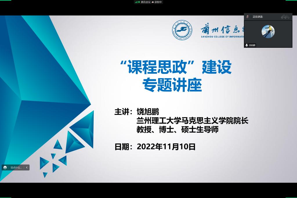 为了进一步提升我校教师开展课程思政建设能力,根据学校教学工作安排,兰州信息科技学院马克思主义学院邀请兰州理工大学马克思主义学院院长、硕士生导师饶旭鹏教授于2022年11月10日下午通过“线上平台”为全校专职教师开展了题为“新时代课程思政建设的思考”的专题学术讲座。教务处负责人、二级教学单位负责人、系室主任、全体专职教师参加了讲座。