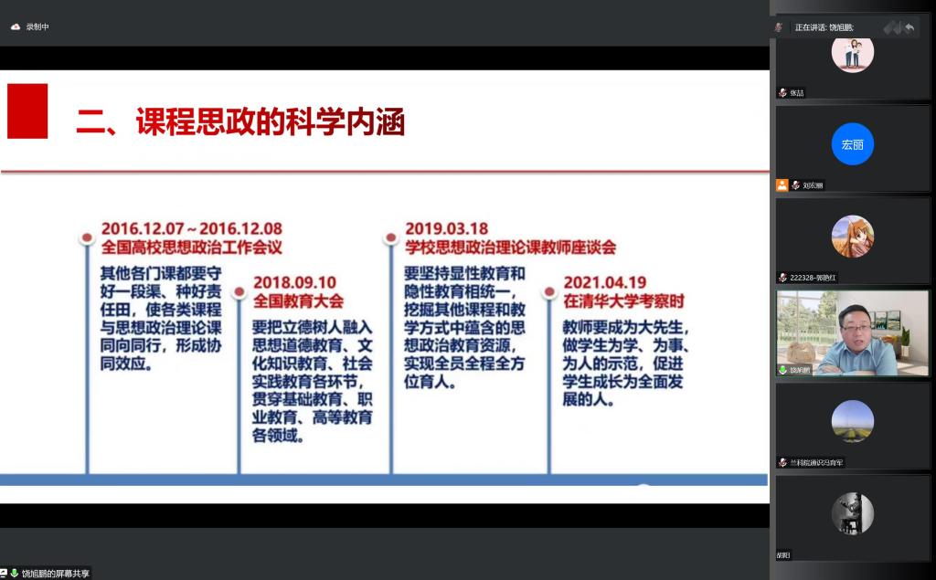 饶旭鹏教授从“思政课总体定位与目标”、“课程思政的科学内涵”和“课程思政建设的基本遵循”三个方面分享了思政课程体系的设置和内涵,如何理解和建设课程思政,怎样实现“同向同行”等内容,同时从理念层面、学校层面、课程层面和教师层面等4个维度对教师开展课程思政给出了方法指导。
