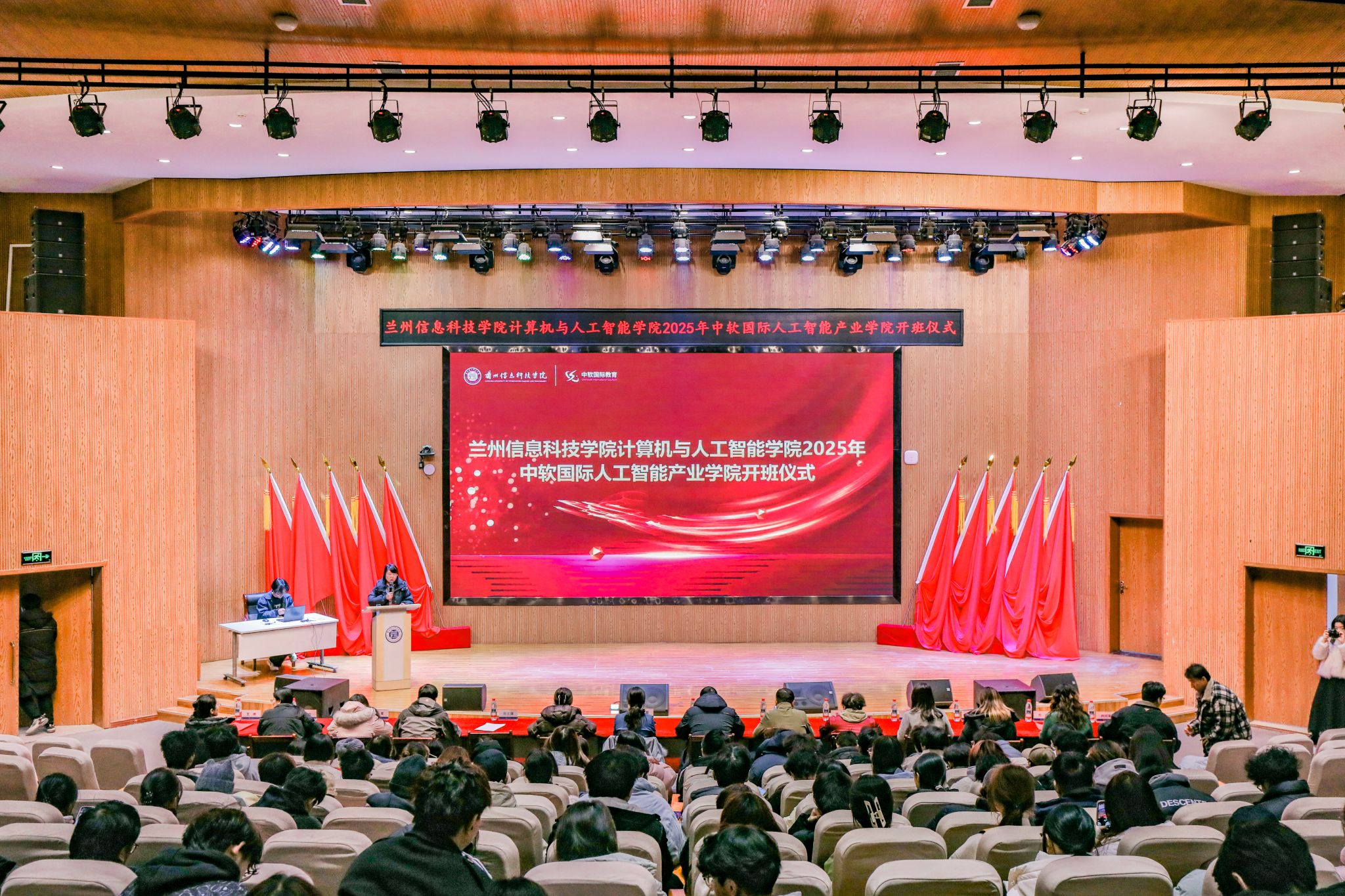 为深化新工科建设,推动SC教学改革与产教融合走深走实,12月5日,兰州信息科技学院2025级中软国际人工智能产业学院开班仪式在学院二号报告厅举行。学院相关负责人、中软国际教育科技集团北方区总经理荣蓉、企业专家团队及2025级全体新生共同参加。