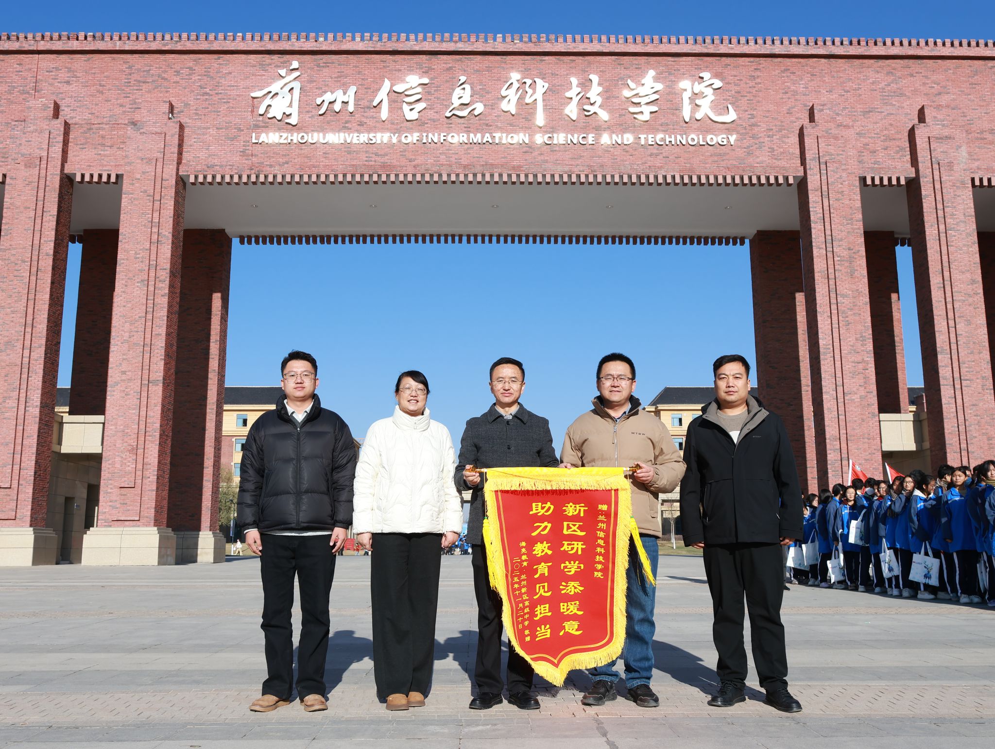 为感谢学校在推动高中——高校衔接、支持区域研学教育方面所做的贡献,兰州新区高级中学代表特向学校赠送了“新区研学添暖意,助力教育见担当”的锦旗,充分肯定学校在校校合作中所体现的社会责任与教育温度。